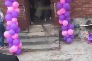 新人结婚当天接亲时,女方家人拿着棍了在门口敲打阻止进门
