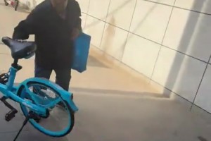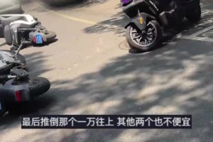 共享单车胡乱停放在路边,大娘路过时直接挨个推倒