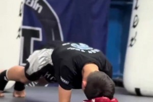 男孩学习搏击,教练为了锻炼学生的抗击打能力,用脚踹在男孩身上